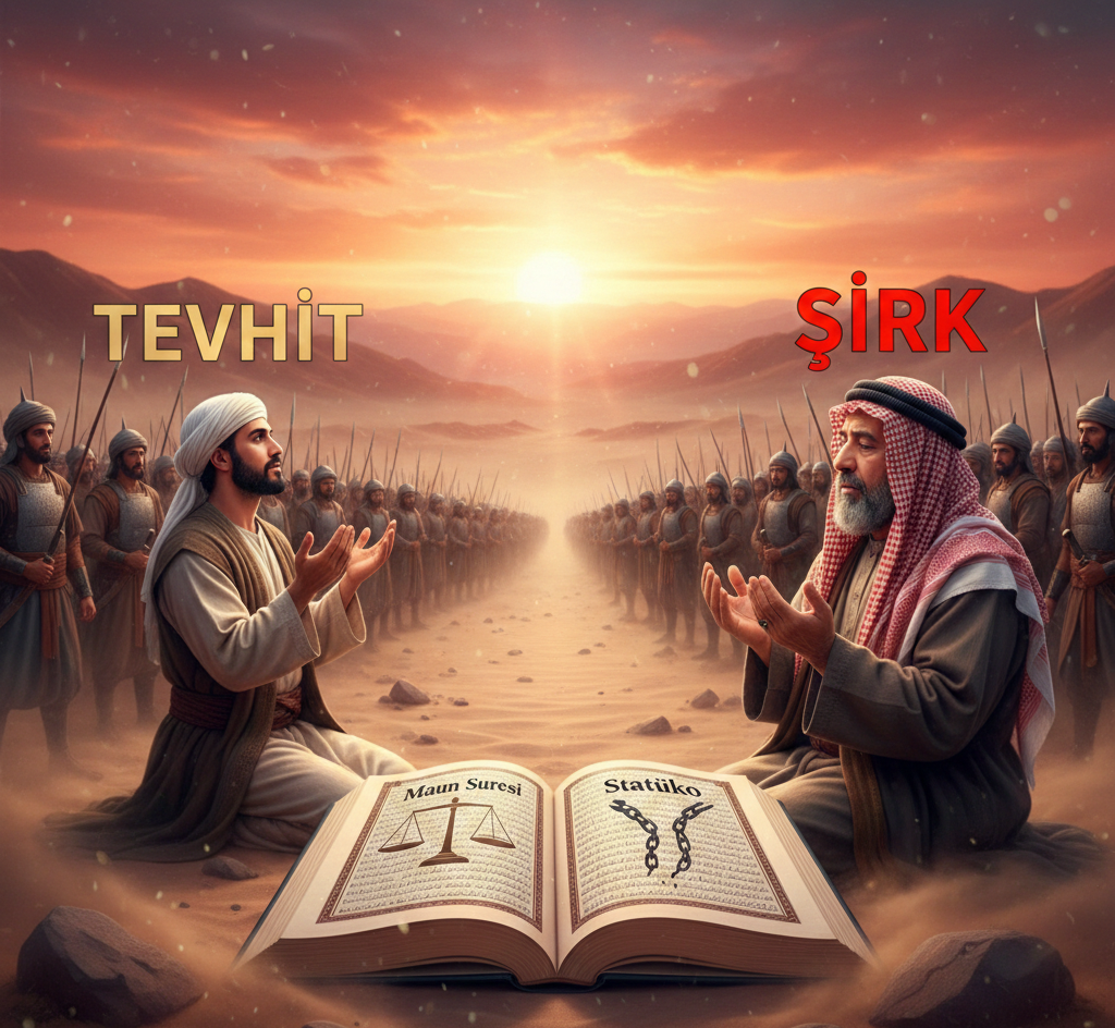 Buradaki kilit nokta “Şirk” kavramıdır. Şirk, Allah’ı inkar etmek değil; Allah ile kul arasına aracılar, imtiyazlar ve zulüm mekanizmaları yerleştirmektir. Ebu Cehil’in savunduğu düzen, statükonun korunduğu, güçlülerin zayıfları ezdiği ve dinin bu sömürüye alet edildiği bir yapıdır.